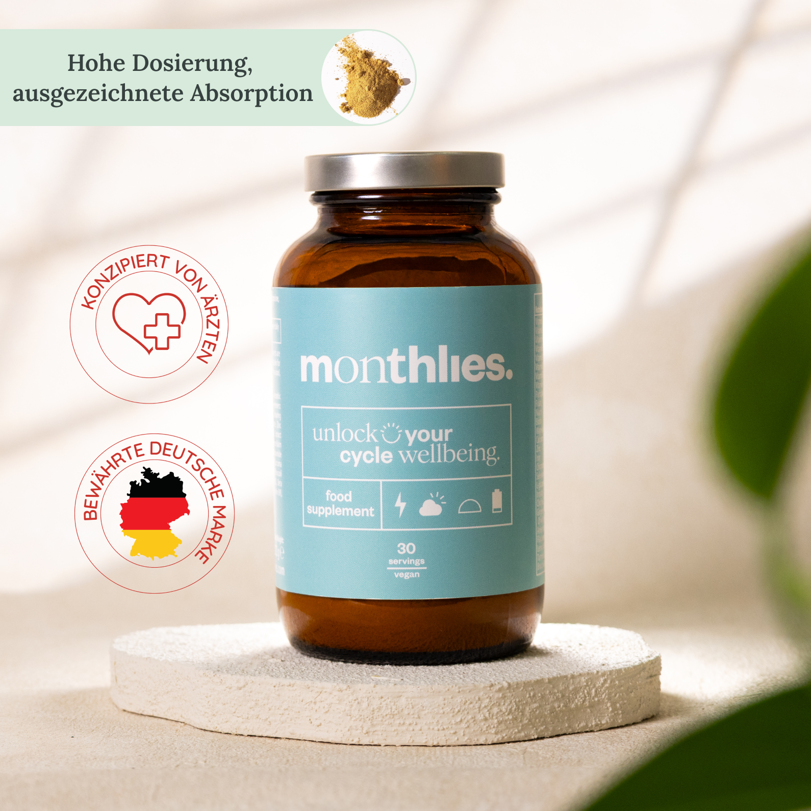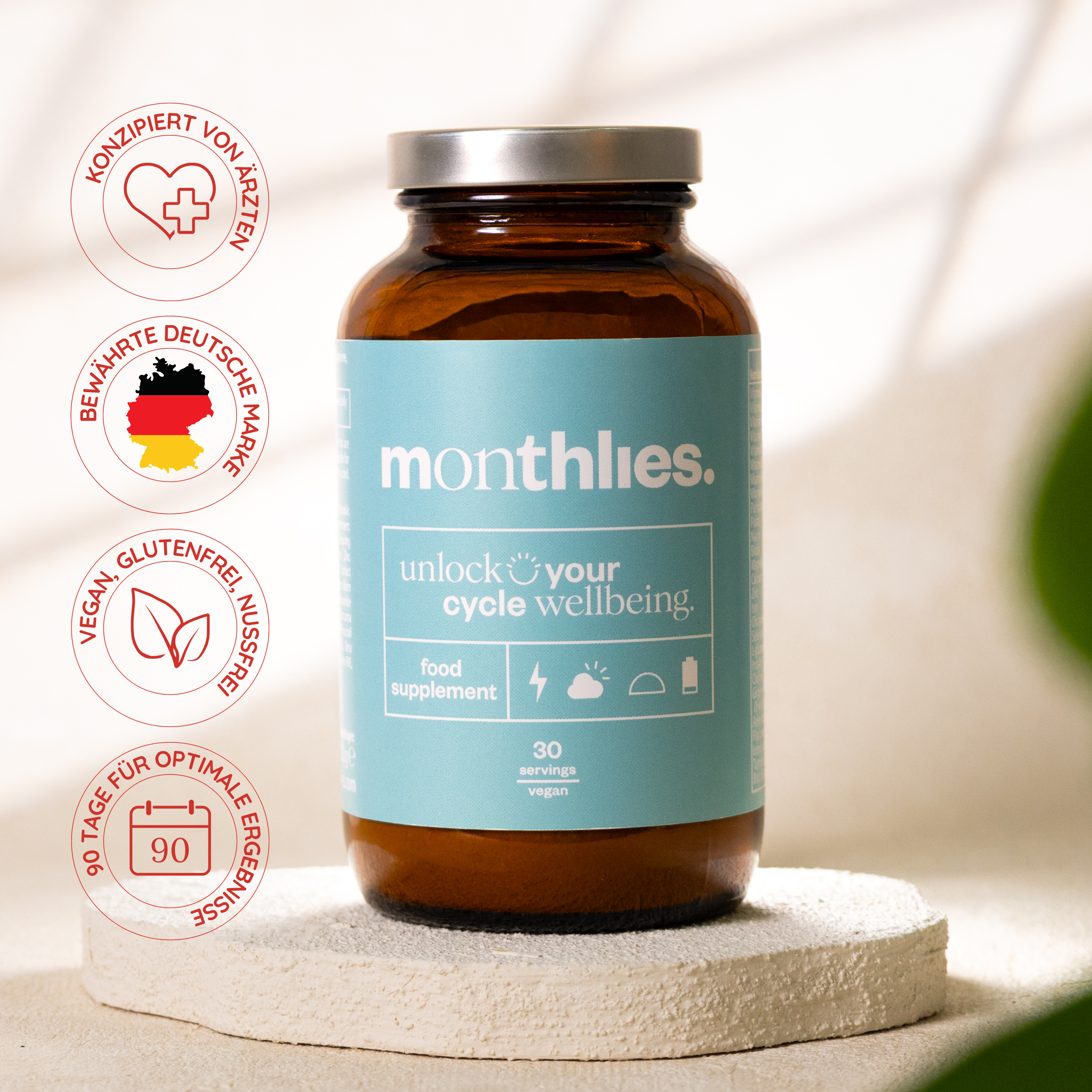 Mit wissenschaftlich geprüften Inhaltsstoffen wie Zitronenmelisse, Brokkolisamen-Extrakt, B-Komplex, Myo-Inositol, Cholin und Leinsamen unterstützt monthlies das hormonelle Gleichgewicht in seinem Kern - es optimiert den Östrogenstoffwechsel, fördert gesundes Progesteron und unterstützt das Stressmanagement.*